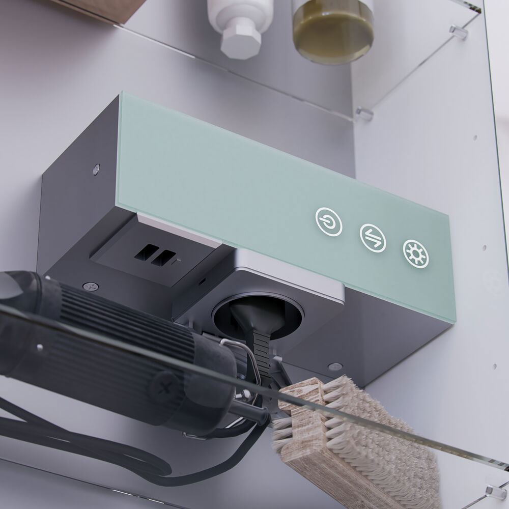 Level spejlskabet giver dig masser af ekstra opbevaring i dit badeværelse. Inde i spejlskabet gemmer dig sig nemlig flere hylder, forstørrelsesspejl, magnetskinne, metalhylde og en stikkontakt, og her får du god plads til tandbørsten, shaver, cremer, deo og meget mere. Spejlskabet har lys i top og bund, som kan styres i både styrke og varme, så du kan få det helt rette lys, som du har brug for. OBS: Der er et opstartstillæg (BI1) til produkter med valgfri farve. Det betales én gang pr. valgfri farve uanset antal produkter.