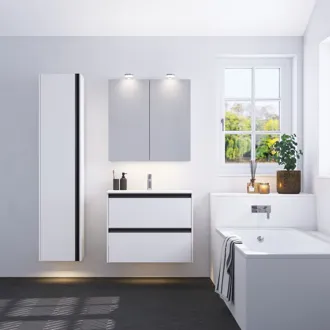 Giv dit badeværelse et moderne touch med et overskab med integreret greb. Dette skabs enkle, men stilfulde design gør det til en ideel løsning til at optimere pladsen. De to glashylder giver mulighed for at vise dine badeværelsesartikler og holde dem organiseret. Med dette overskab får du ikke kun praktisk opbevaring, men også en smuk detalje, der kan kombineres med en åben reol, hvilket tilføjer både funktionalitet og æstetik til dit badeværelse. OBS: Der er et opstartstillæg (BI1) til produkter med valgfri farve. Det betales én gang pr. valgfri farve uanset antal produkter. Husk at tilvælge de små praktiske ting til dine badeværelsesmøbler, som du dagligt vil glæde dig over. Fx lys i skuffer og skabe, indbygget el-stik og dæmpet sensorlys under møblet, som guider det natlige badeværelsesbesøg. Tilvalg bestilles samtidig med dine møbler.