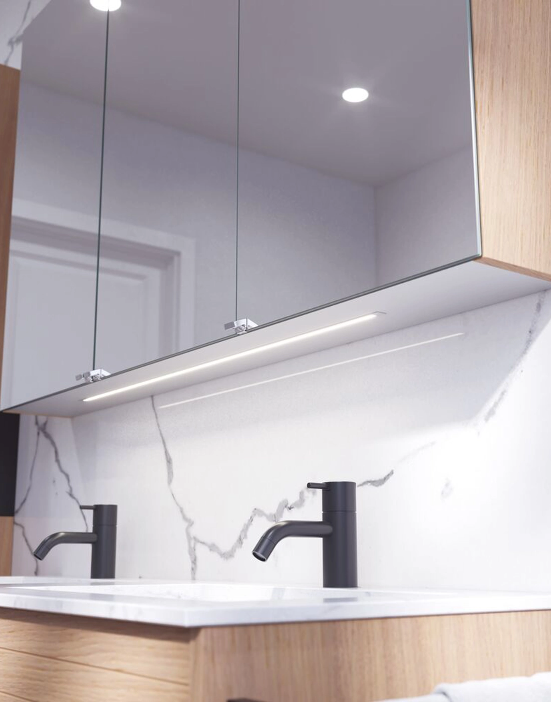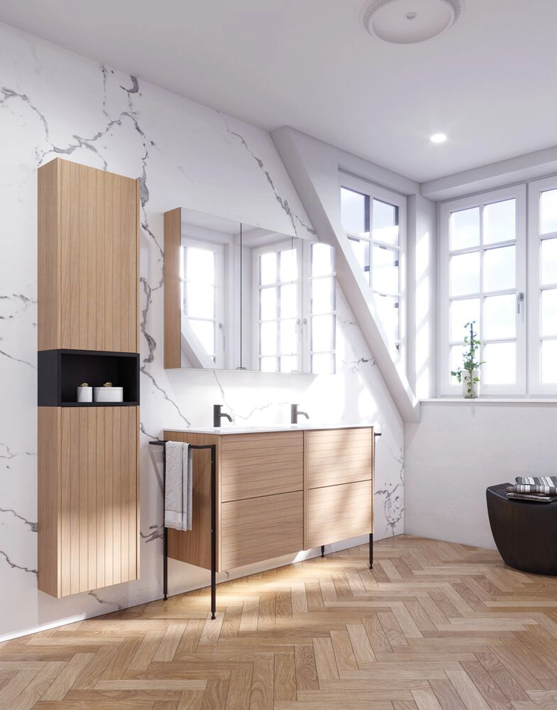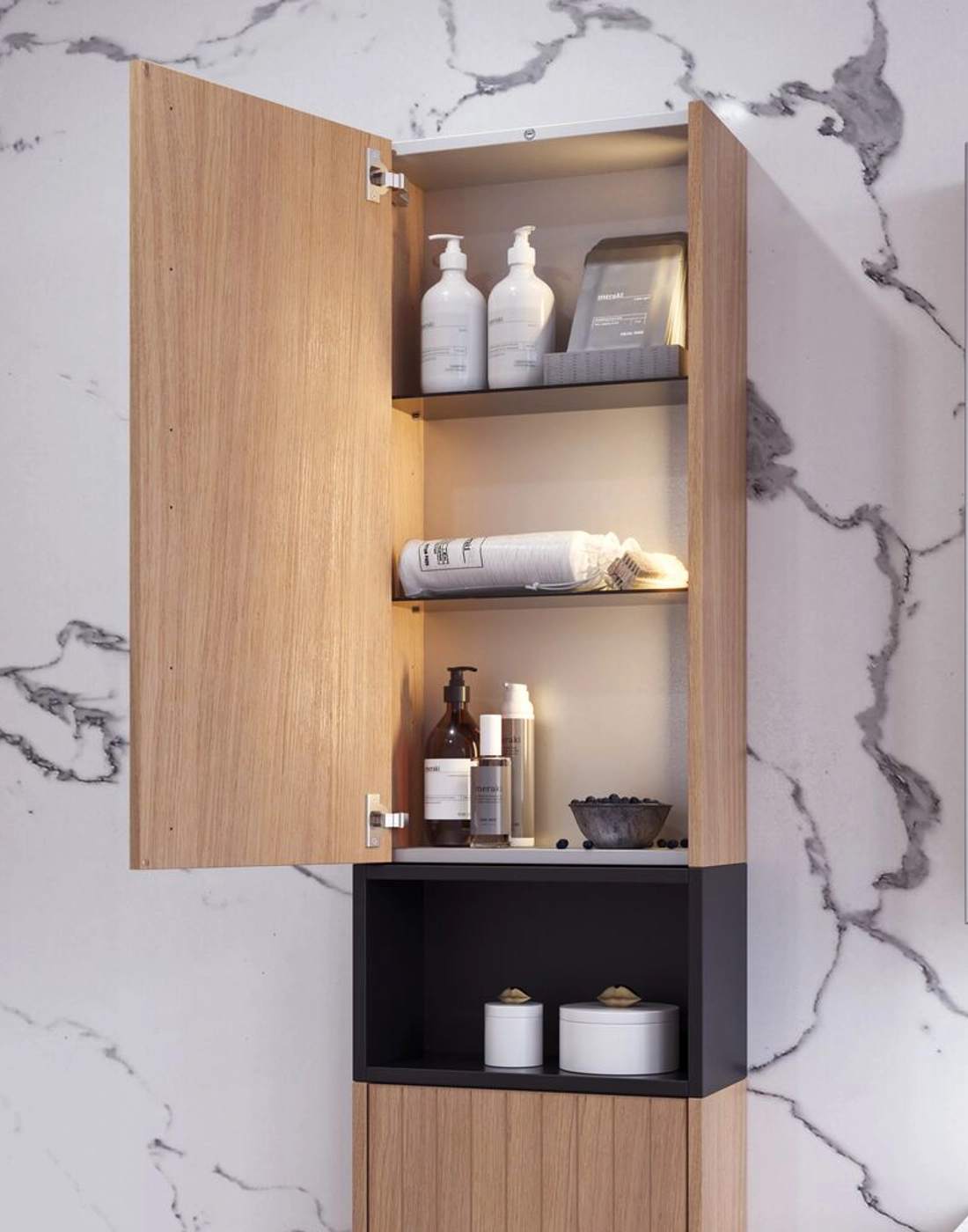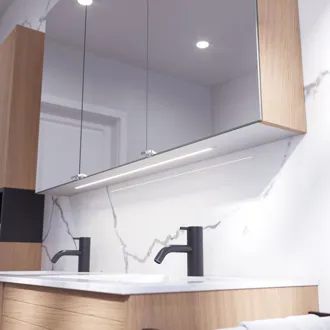 Skab en hyggelig og indbydende stemning med et overskab med lamelfront. De to glashylder giver rig mulighed for at organisere og udstille dine favoritter, samtidig med at det unikke design tilføjer karakter til dit badeværelse. Med en bredde på 40 cm og en dybde på 19 cm er dette skab perfekt til at maksimere opbevaringspladsen. Når det kombineres med en åben reol, får du en smart og stilfuld løsning, der fremhæver både funktionalitet og personlighed i rummet. Husk at tilvælge de små praktiske ting til dine badeværelsesmøbler, som du dagligt vil glæde dig over. Fx lys i skuffer og skabe, indbygget el-stik og dæmpet sensorlys under møblet, som guider det natlige badeværelsesbesøg. Tilvalg bestilles samtidig med dine møbler.