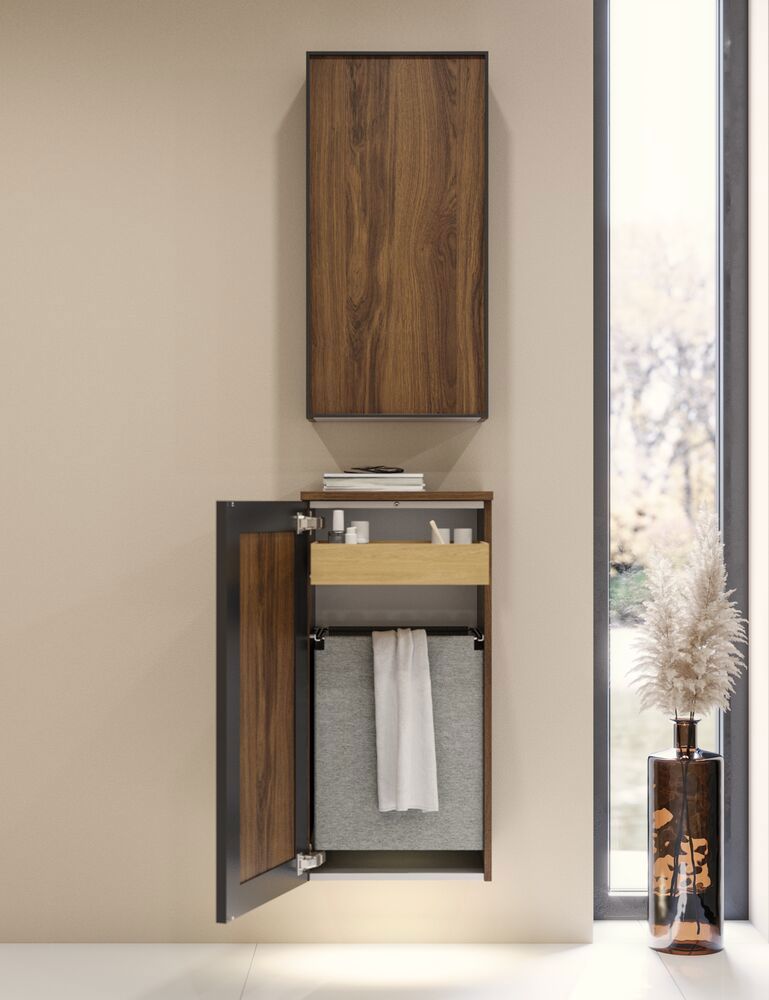 Skab ekstra opbevaring med Dansani overskab, der har en sort ramme og 2 glashylder, som giver en moderne og elegant løsning til dit badeværelse. Den sorte ramme tilføjer et sofistikeret look, der passer godt ind i moderne badeværelsesindretning. Brug overskabet til at holde styr på dine cremer, deo og andre nødvendige produkter, så badeværelset altid fremstår ryddeligt og stilfuldt. Med flere farvemuligheder kan du nemt matche skabet til resten af dit badeværelse. OBS: Der er et opstartstillæg (BI1) til produkter med valgfri farve. Det betales én gang pr. valgfri farve uanset antal produkter. Husk at tilvælge de små praktiske ting til dine badeværelsesmøbler, som du dagligt vil glæde dig over. Fx lys i skuffer og skabe, indbygget el-stik og dæmpet sensorlys under møblet, som guider det natlige badeværelsesbesøg. Tilvalg bestilles samtidig med dine møbler.