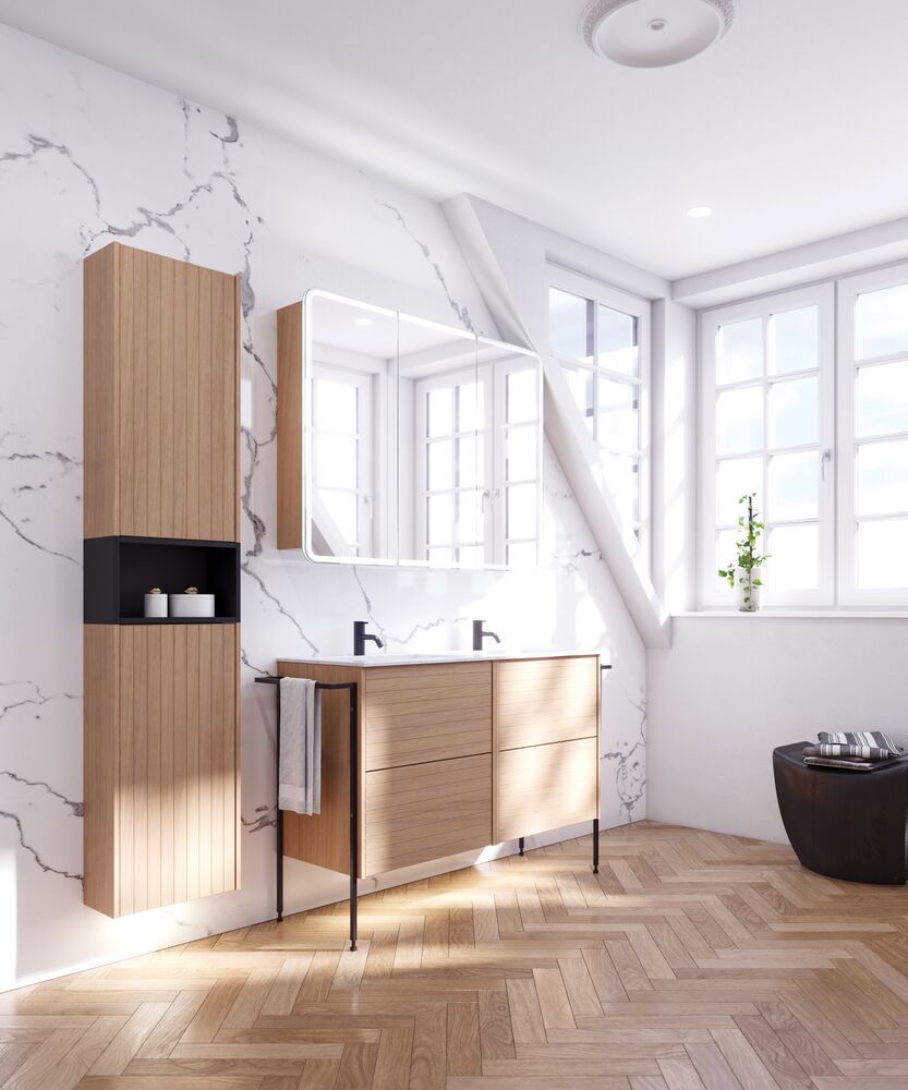 Radience-spejlskabet forener moderne design og praktisk opbevaring i ét. Bag de elegante spejldøre finder du masser af plads til dine daglige toiletartikler, så du nemt kan holde orden på badeværelset. Lysrammen rundt i kanten giver en smuk indramning af dit spejlbillede og skaber et behageligt lys, som du kan styre trådløst direkte fra døren. Med anti-dug funktion i spejlet og mulighed for forskellige størrelser og farver er Radience både en praktisk og stilren løsning – perfekt til tidens trend, hvor badeværelset skal være både funktionelt og personligt. OBS: Der er et opstartstillæg (BI1) til produkter med valgfri farve. Det betales én gang pr. valgfri farve uanset antal produkter.