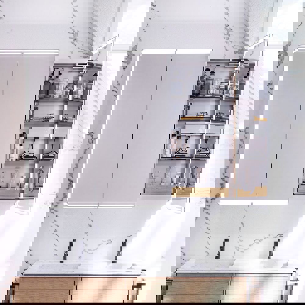 Radience-spejlskabet forener moderne design og praktisk opbevaring i ét. Bag de elegante spejldøre finder du masser af plads til dine daglige toiletartikler, så du nemt kan holde orden på badeværelset. Lysrammen rundt i kanten giver en smuk indramning af dit spejlbillede og skaber et behageligt lys, som du kan styre trådløst direkte fra døren. Med anti-dug funktion i spejlet og mulighed for forskellige størrelser og farver er Radience både en praktisk og stilren løsning – perfekt til tidens trend, hvor badeværelset skal være både funktionelt og personligt.