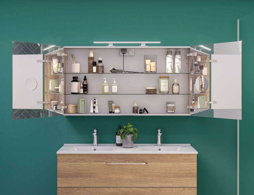 Select spejlskabet er meget mere end bare et spejlskab - det er din personlige opgradering til badeværelset. Vælg dine egne lamper og skab den perfekte belysning til at starte dagen med stil. Med spejlskabet får du masser af opbevaring samt en stikkontakt inde i spejlskabet til dine elektriske apparater. Oplev bekvemmelighed og elegance i ét med Select spejlskabet - din daglige følgesvend til en strålende morgen.