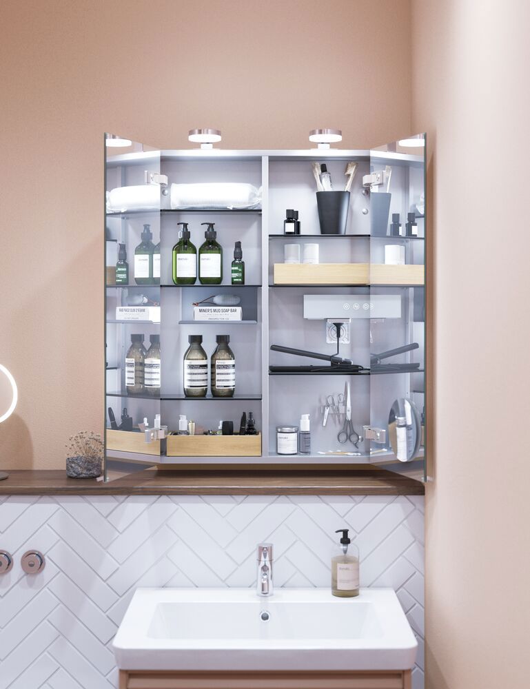 Få praktisk opbevaring og lækkert design med Style spejlskabet. Spejlskabet er perfekt til at opbevare alle dine cremer, deo, negleklipper, tandbørster og meget mere. Tilvælg lamper til spejlskabet og styr lysets temperatur og styrke med et enkelt tryk. Det flotte spejlskab indeholder magnetskinne, metalhylde, forstørrelsesspejl og stikkontakt, hvilket gør din morgen- og aftenrutine meget nemmere. OBS: Der er et opstartstillæg (BI1) til produkter med valgfri farve. Det betales én gang pr. valgfri farve uanset antal produkter.