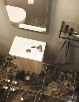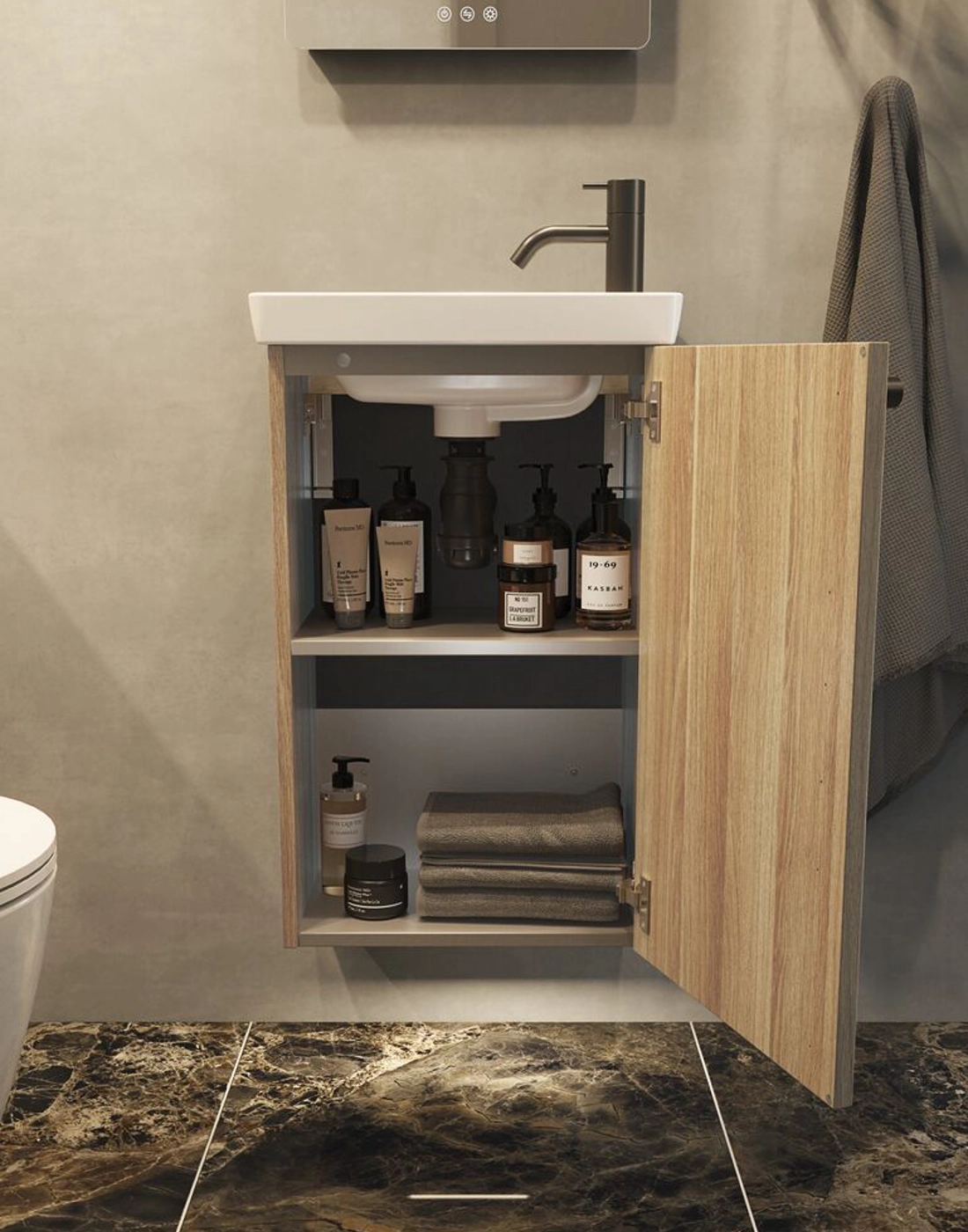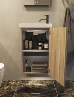 Vaskeskabet med 1 låge er den ideelle løsning til små badeværelser. Med en dybde på kun 26 cm optager det minimal plads, men giver stadig praktisk opbevaring. Det stilrene design passer perfekt til enhver indretning. Skabet er både funktionelt og æstetisk tiltalende og hjælper med at skabe orden og elegance i dit badeværelse. Opgrader dit rum med vaskeskabet og nyd en smart, pladsbesparende løsning. OBS: Der er et opstartstillæg (BI1) til produkter med valgfri farve. Det betales én gang pr. valgfri farve uanset antal produkter. Husk at tilvælge de små praktiske ting til dine badeværelsesmøbler, som du dagligt vil glæde dig over. Fx lys i skuffer og skabe, indbygget el-stik og dæmpet sensorlys under møblet, som guider det natlige badeværelsesbesøg. Tilvalg bestilles samtidig med dine møbler.