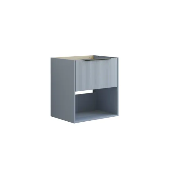 Dette vaskeskab kombinerer det bedste fra flere verdener: en praktisk skuffe, et åbent rum til udstilling af dine yndlingsting og en stribet front, der giver et unikt og elegant udtryk. Vælg mellem farverne hvid, sand eller lyseblå for at finde den, der passer bedst til dit badeværelse. Grebet er allerede monteret, så det er klar til brug.