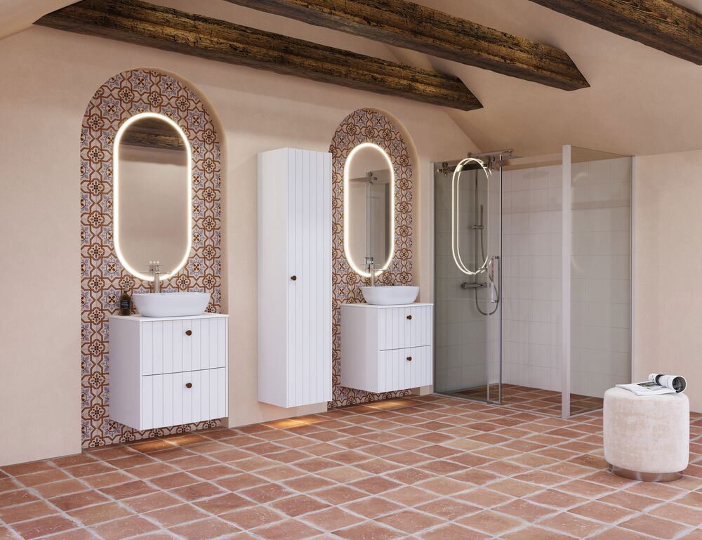 Disse vaskeskabe med 2 skuffer tilbyder et charmerende retro-design til dit badeværelse. De buede fronter har smukke riller, der giver et karakterfuldt udtryk. Skabene fås i flere forskellige farver, så du kan vælge den farve, der passer bedst til din personlige stil. Udover deres smukke udseende er skabene også praktiske med to rummelige skuffer til opbevaring af dine fornødenheder. Tilføj tidløs elegance til dit badeværelse med disse vaskeskabe og nyd det unikke præg, de bringer til rummet. OBS: Der er et opstartstillæg (BI1) til produkter med valgfri farve. Det betales én gang pr. valgfri farve uanset antal produkter. Husk at tilvælge de små praktiske ting til dine badeværelsesmøbler, som du dagligt vil glæde dig over. Fx lys i skuffer og skabe, indbygget el-stik og dæmpet sensorlys under møblet, som guider det natlige badeværelsesbesøg. Tilvalg bestilles samtidig med dine møbler.