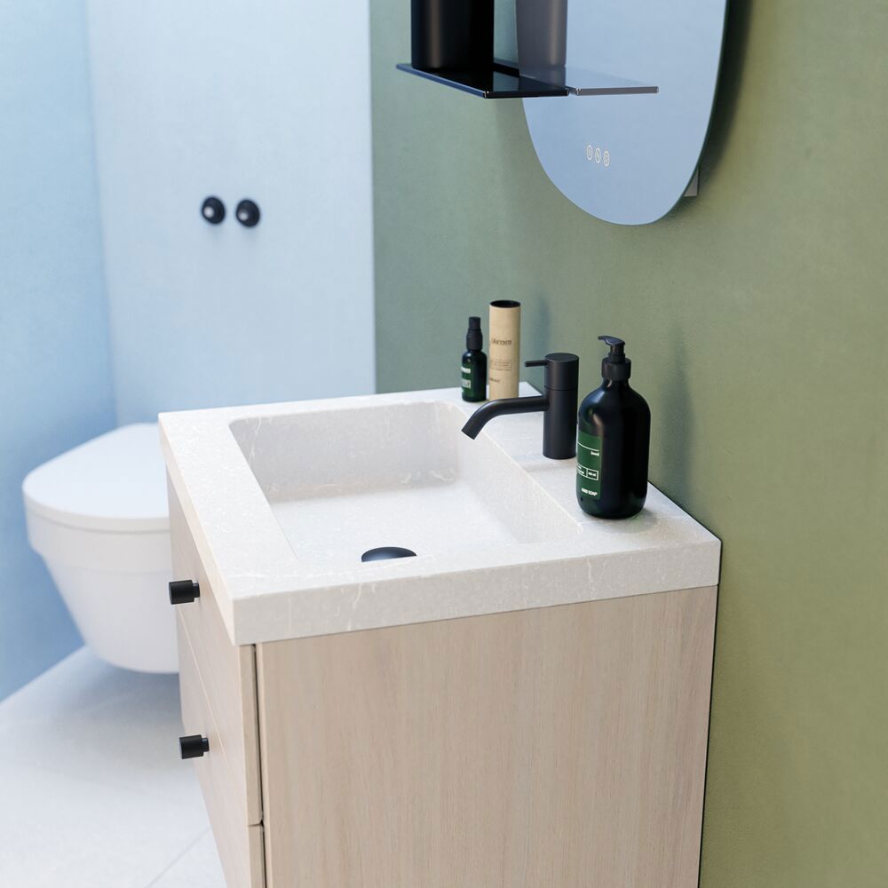 Dansani Calidris vaskeskab med 2 skuffer er en lækker fusion af stil og funktionalitet til dit badeværelse. Det minimalistiske design og rene linjer i Calidris vaskeskabet tilføjer en sofistikeret æstetik til dit badeværelsesmiljø. De to rummelige skuffer giver ikke kun praktisk opbevaring, men giver dig også mulighed for at holde ro og orden på badeværelset. Med fokus på både funktionalitet og design er Dansani Calidris vaskeskab med 2 skuffer det ideelle valg til dig, der vil have en elegant og velorganiseret løsning til badeværelset. OBS: Der er et opstartstillæg (BI1) til produkter med eg og valgfri farve. Betales én gang pr. eg og valgfri farve uanset antal produkter. Husk at tilvælge de små praktiske ting til dine badeværelsesmøbler, som du dagligt vil glæde dig over. Fx lys i skuffer og skabe, indbygget el-stik og dæmpet sensorlys under møblet, som guider det natlige badeværelsesbesøg. Tilvalg bestilles samtidig med dine møbler.