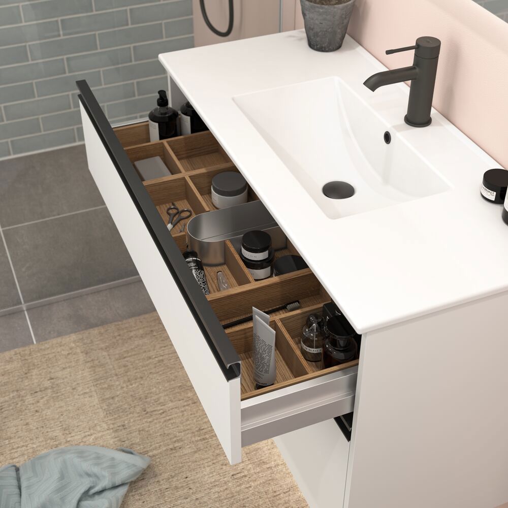 Dansani Calidris vaskeskab med 2 skuffer er en lækker fusion af stil og funktionalitet til dit badeværelse. Det minimalistiske design og rene linjer i Calidris vaskeskabet tilføjer en sofistikeret æstetik til dit badeværelsesmiljø. De to rummelige skuffer giver ikke kun praktisk opbevaring, men giver dig også mulighed for at holde ro og orden på badeværelset. Med fokus på både funktionalitet og design er Dansani Calidris vaskeskab med 2 skuffer det ideelle valg til dig, der vil have en elegant og velorganiseret løsning til badeværelset. OBS: Der er et opstartstillæg (BI1) til produkter med eg og valgfri farve. Betales én gang pr. eg og valgfri farve uanset antal produkter. Husk at tilvælge de små praktiske ting til dine badeværelsesmøbler, som du dagligt vil glæde dig over. Fx lys i skuffer og skabe, indbygget el-stik og dæmpet sensorlys under møblet, som guider det natlige badeværelsesbesøg. Tilvalg bestilles samtidig med dine møbler.