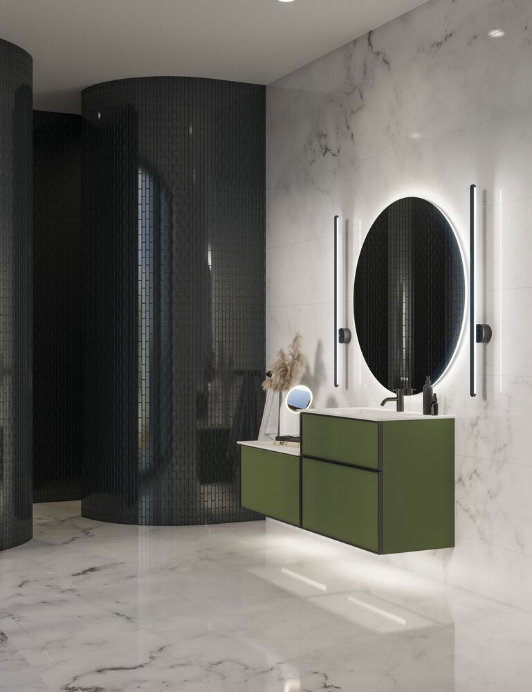 I 2026 handler indretning af badeværelset om at finde den helt rigtige balance: Det skal føles roligt og indbydende – men samtidig være stramt, funktionelt og nemt at holde i hverdagen. Vi ser især fire tendenser gå igen: runde former, greb i metal og træ, rene linjer med aflange lamper samt sort, matteret glas i bruseafskærmningen. Sammen skaber de et moderne badeværelse med masser af ro, varme og personlighed.