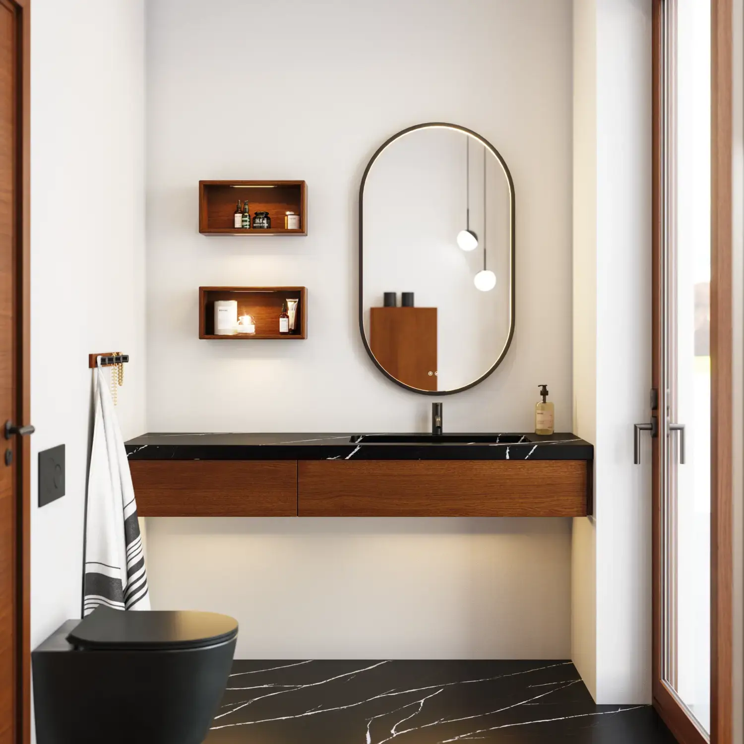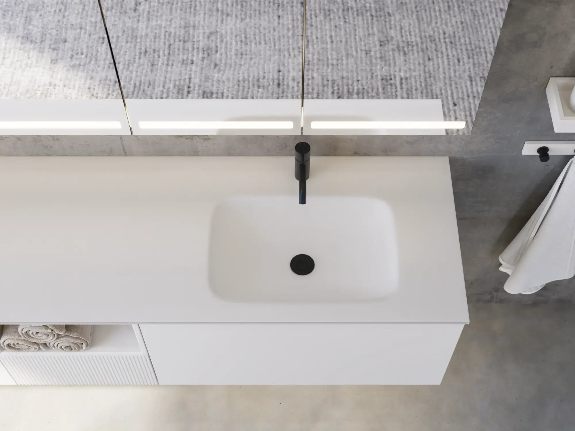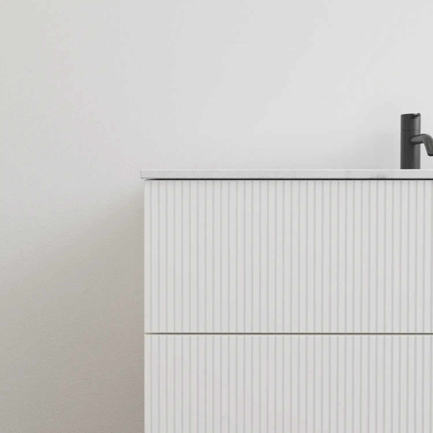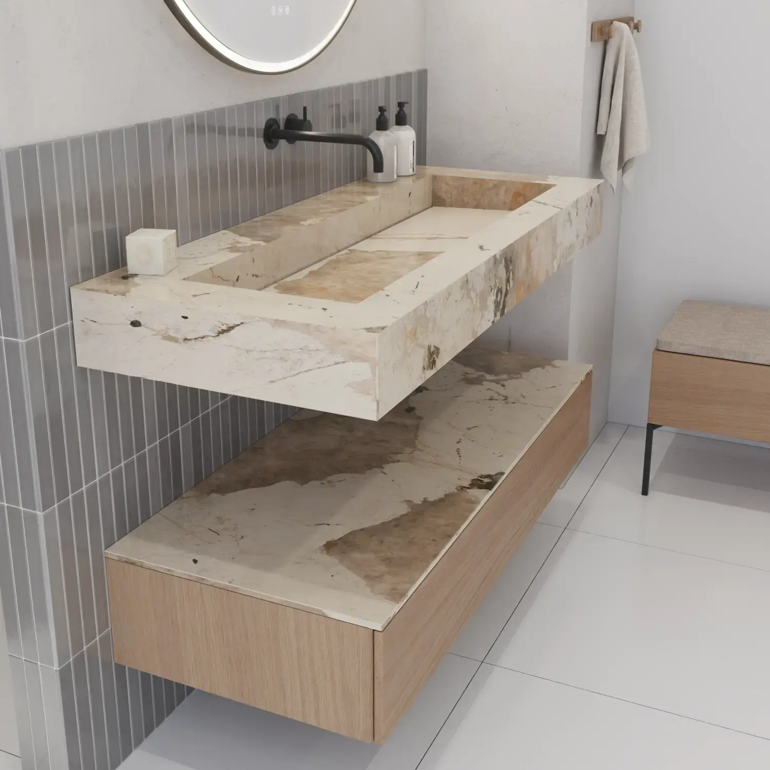 Den flotte vask sætter tonen for et moderne badeværelse, hvor æstetik og funktion går hånd i hånd. Det svævende design og de horisontale linjer giver en let og arkitektonisk balance – et trendy look, der føles både eksklusivt og naturligt på samme tid.