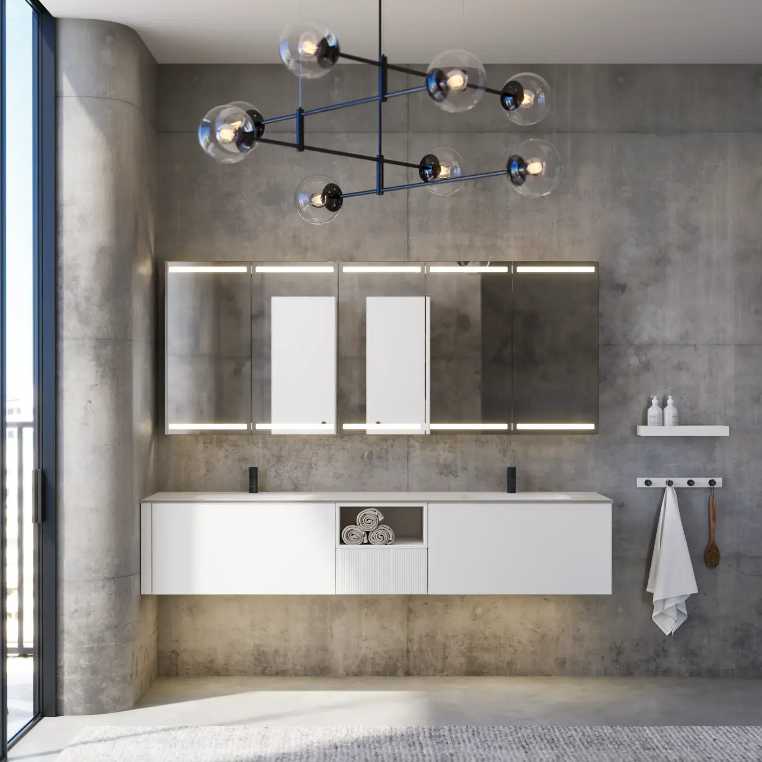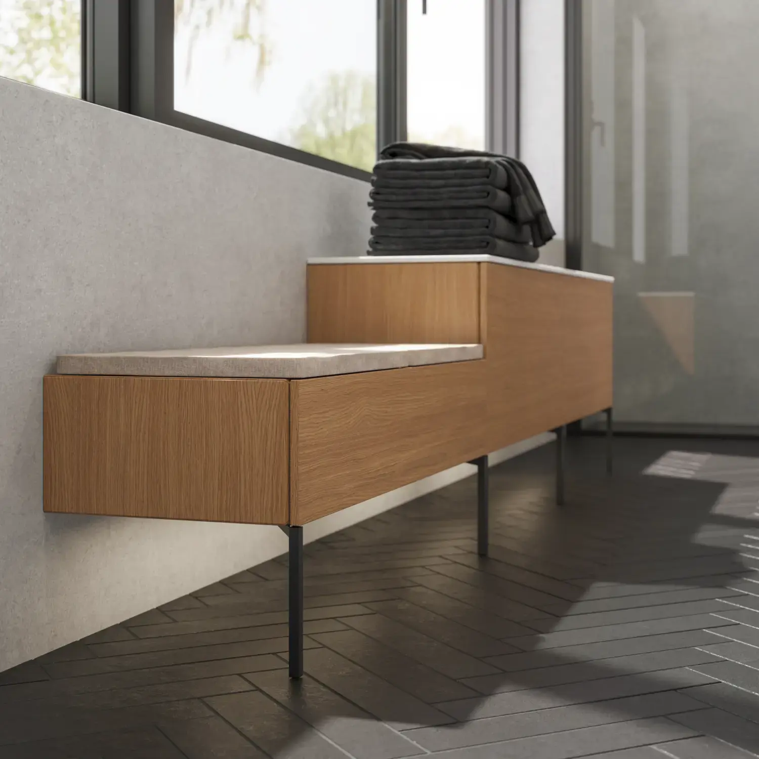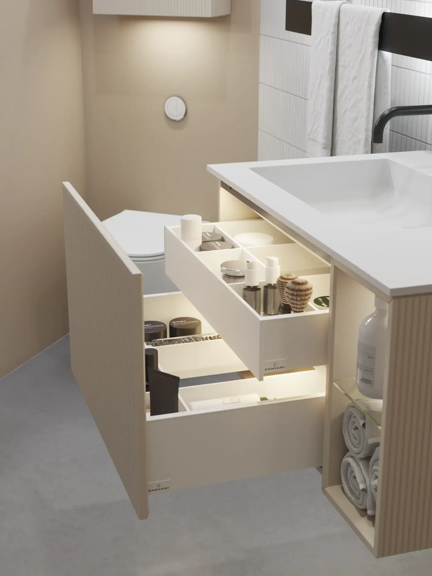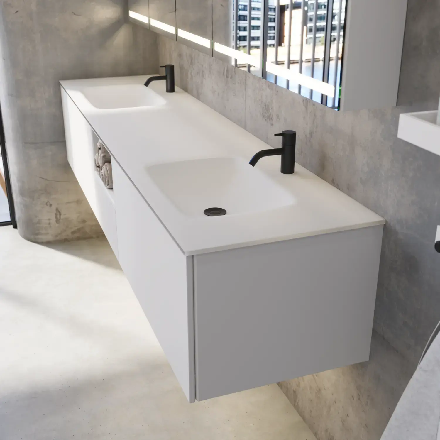Den flotte vask sætter tonen for et moderne badeværelse, hvor æstetik og funktion går hånd i hånd. Det svævende design og de horisontale linjer giver en let og arkitektonisk balance – et trendy look, der føles både eksklusivt og naturligt på samme tid.