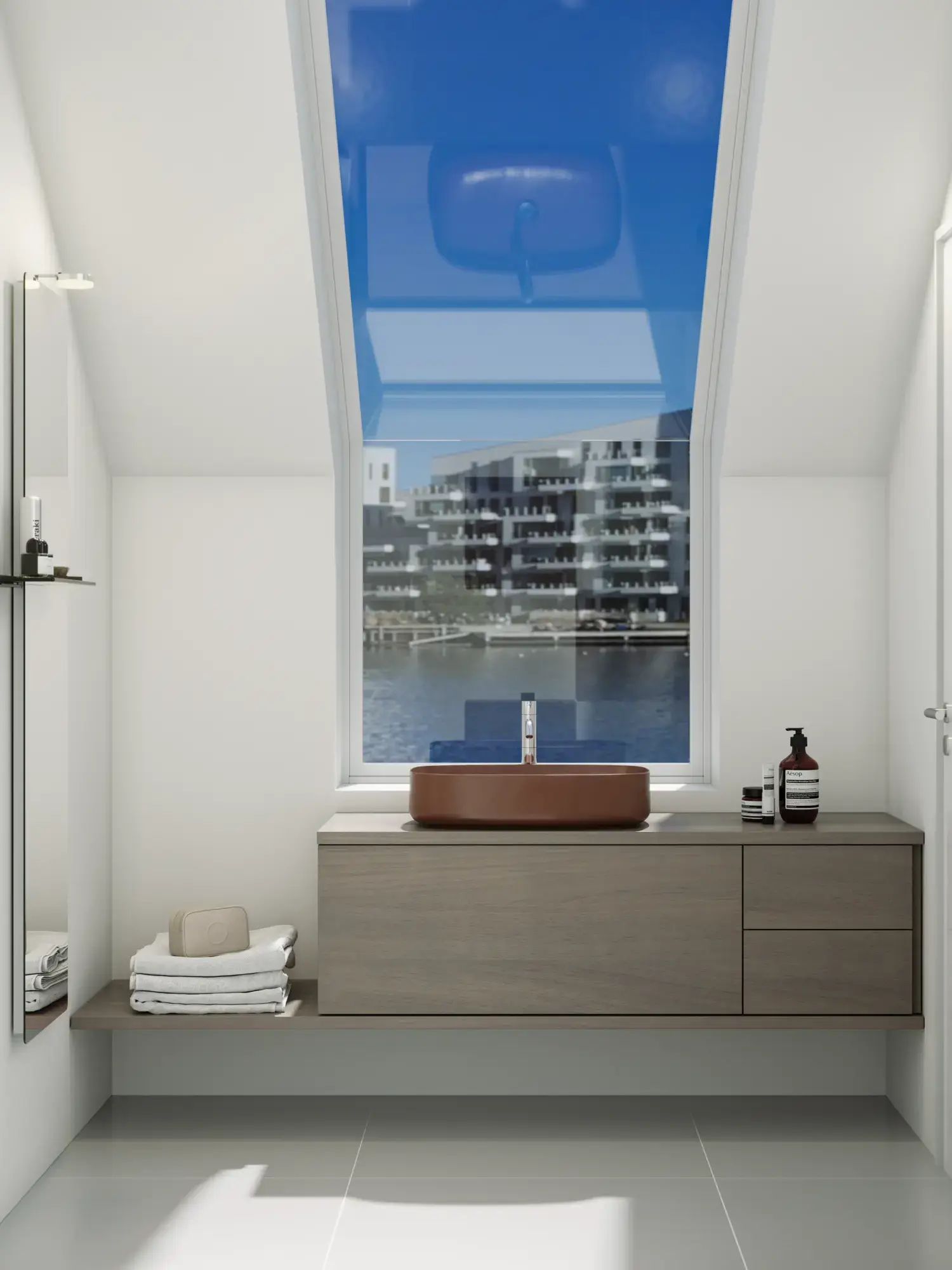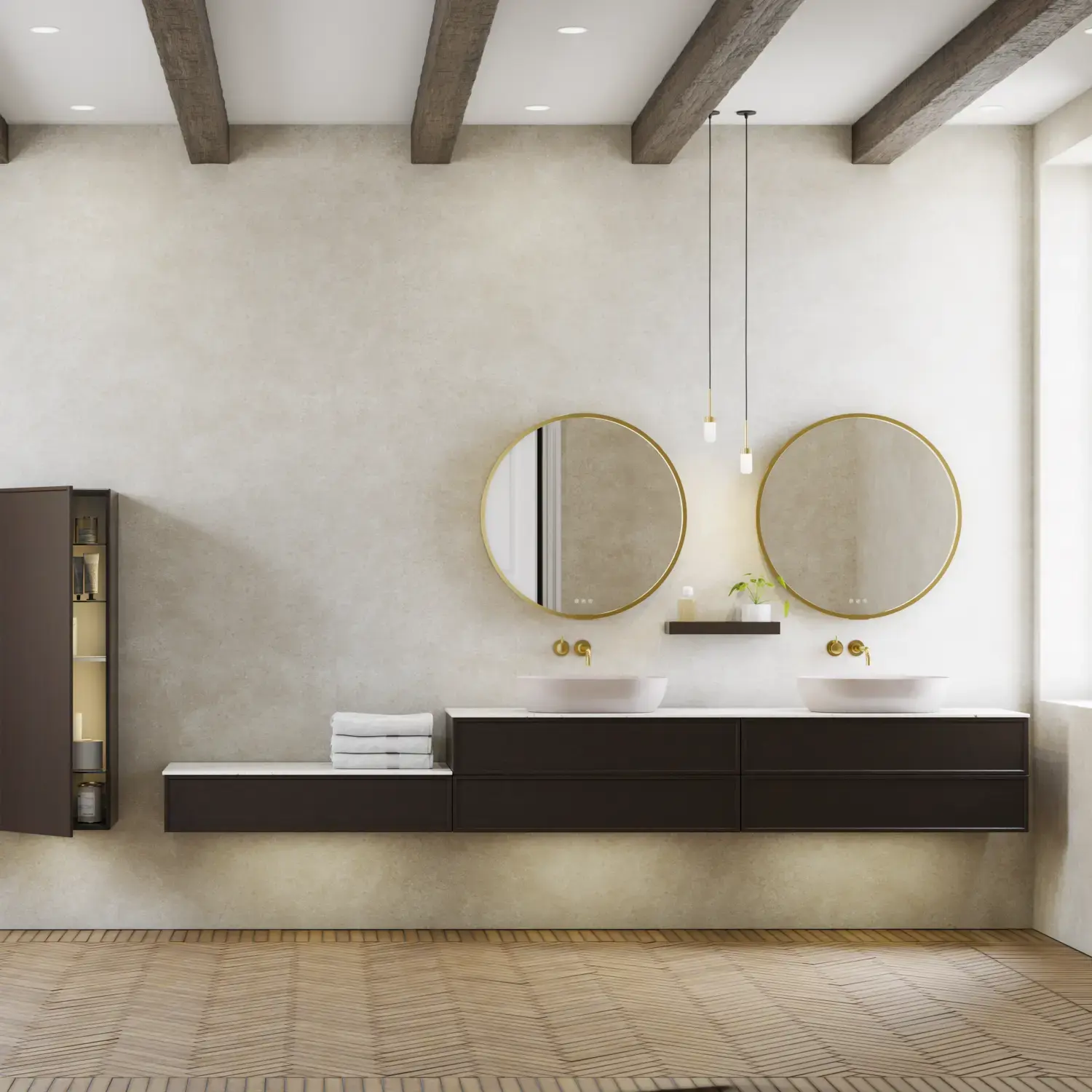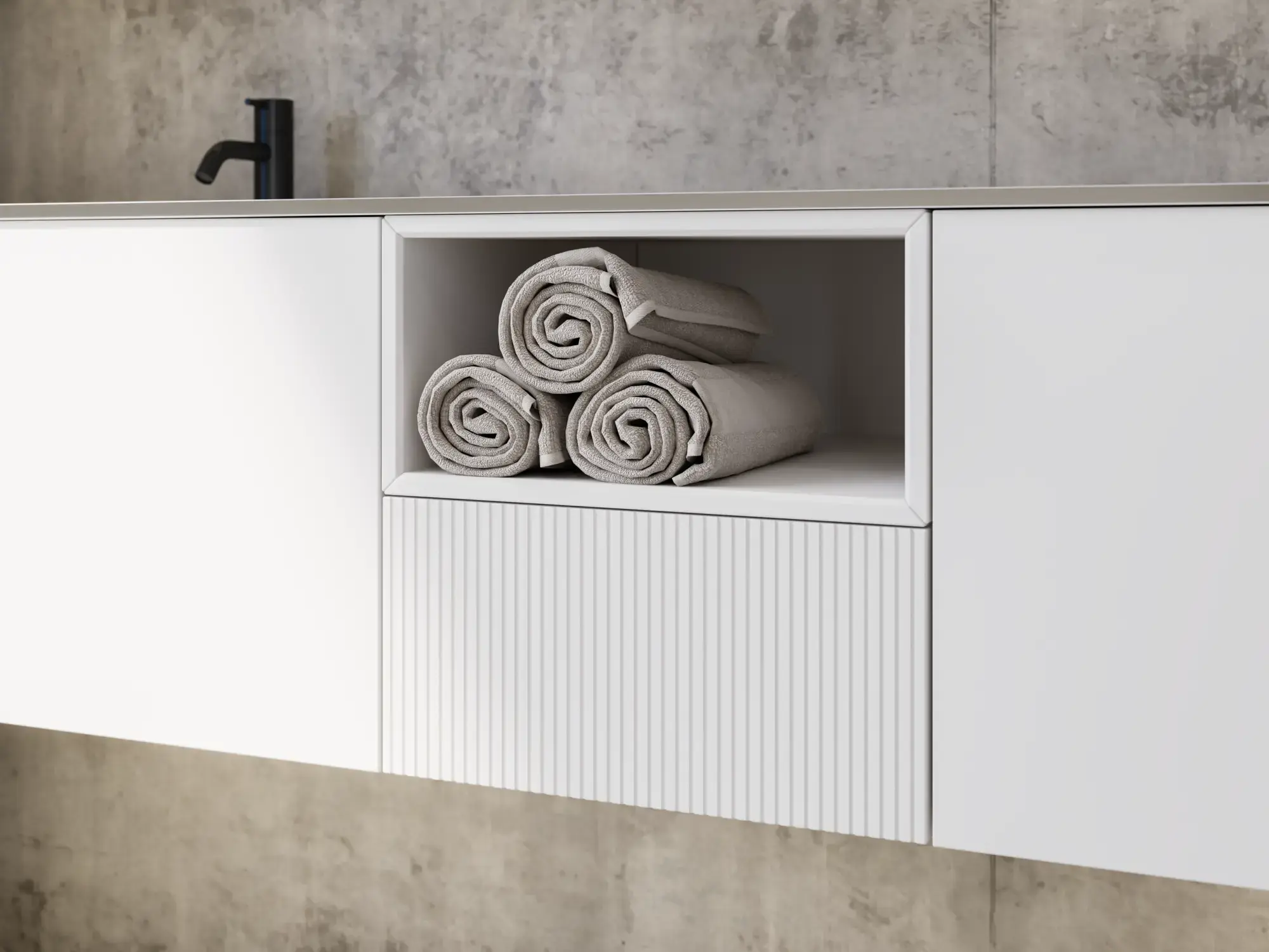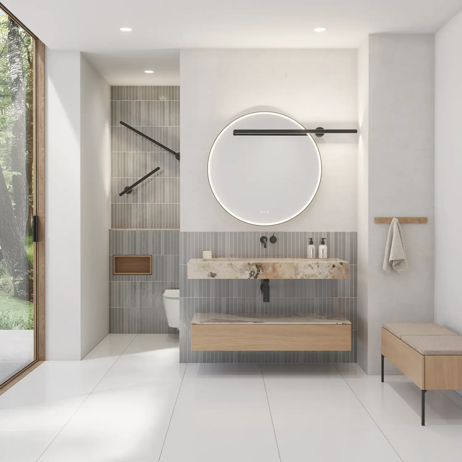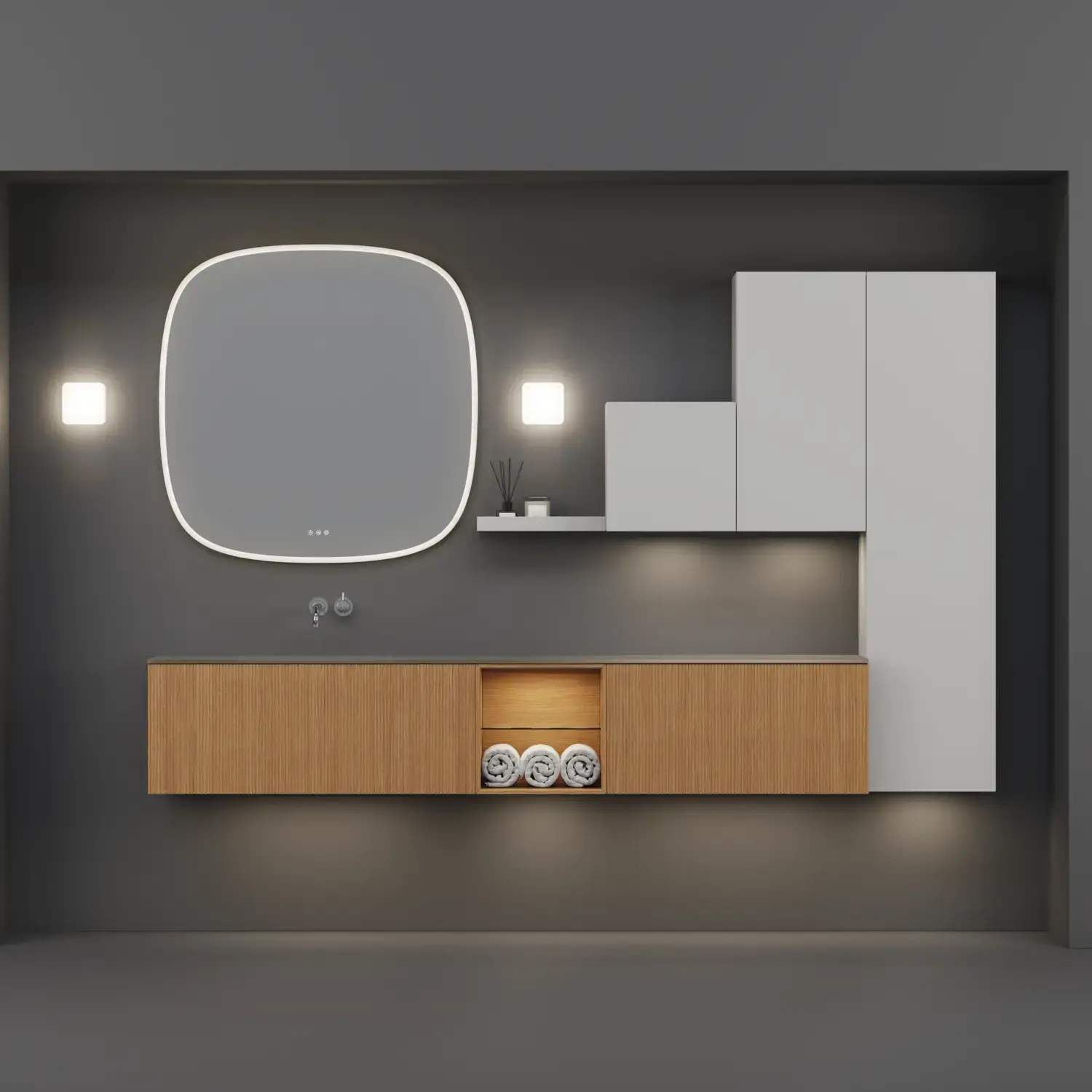 Den flotte vask sætter tonen for et moderne badeværelse, hvor æstetik og funktion går hånd i hånd. Det svævende design og de horisontale linjer giver en let og arkitektonisk balance – et trendy look, der føles både eksklusivt og naturligt på samme tid.