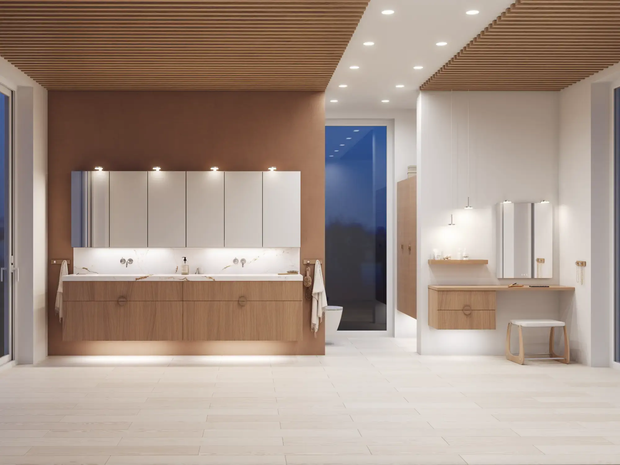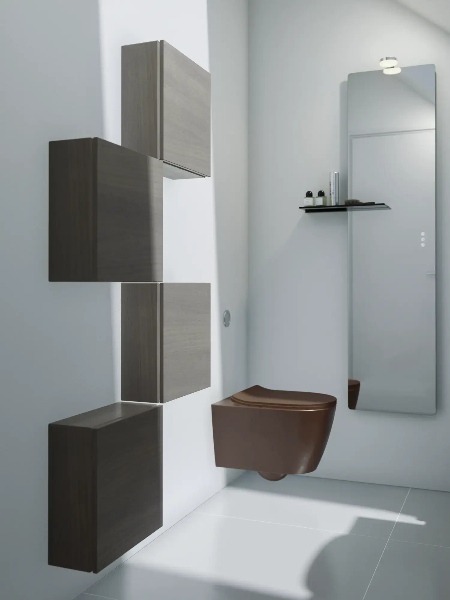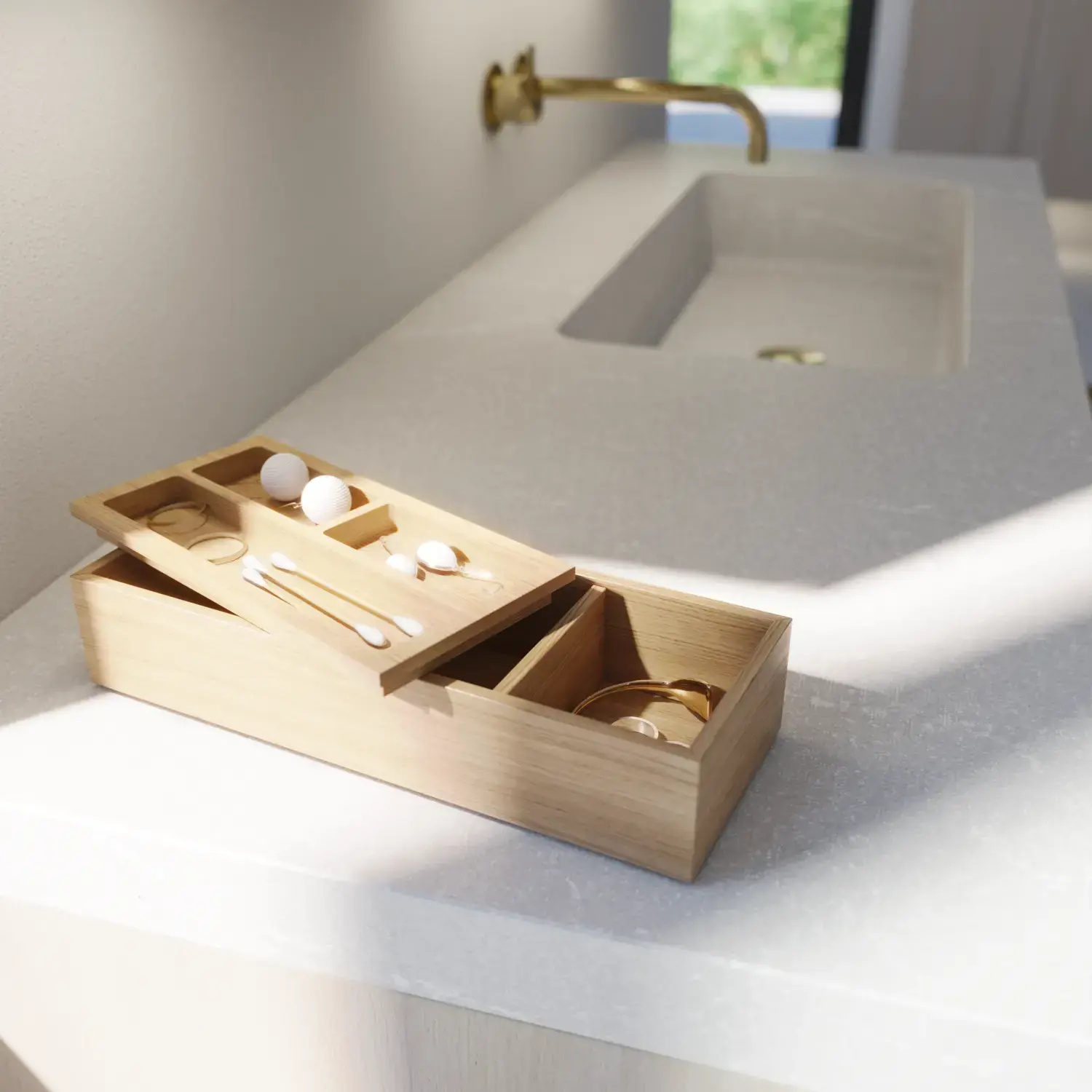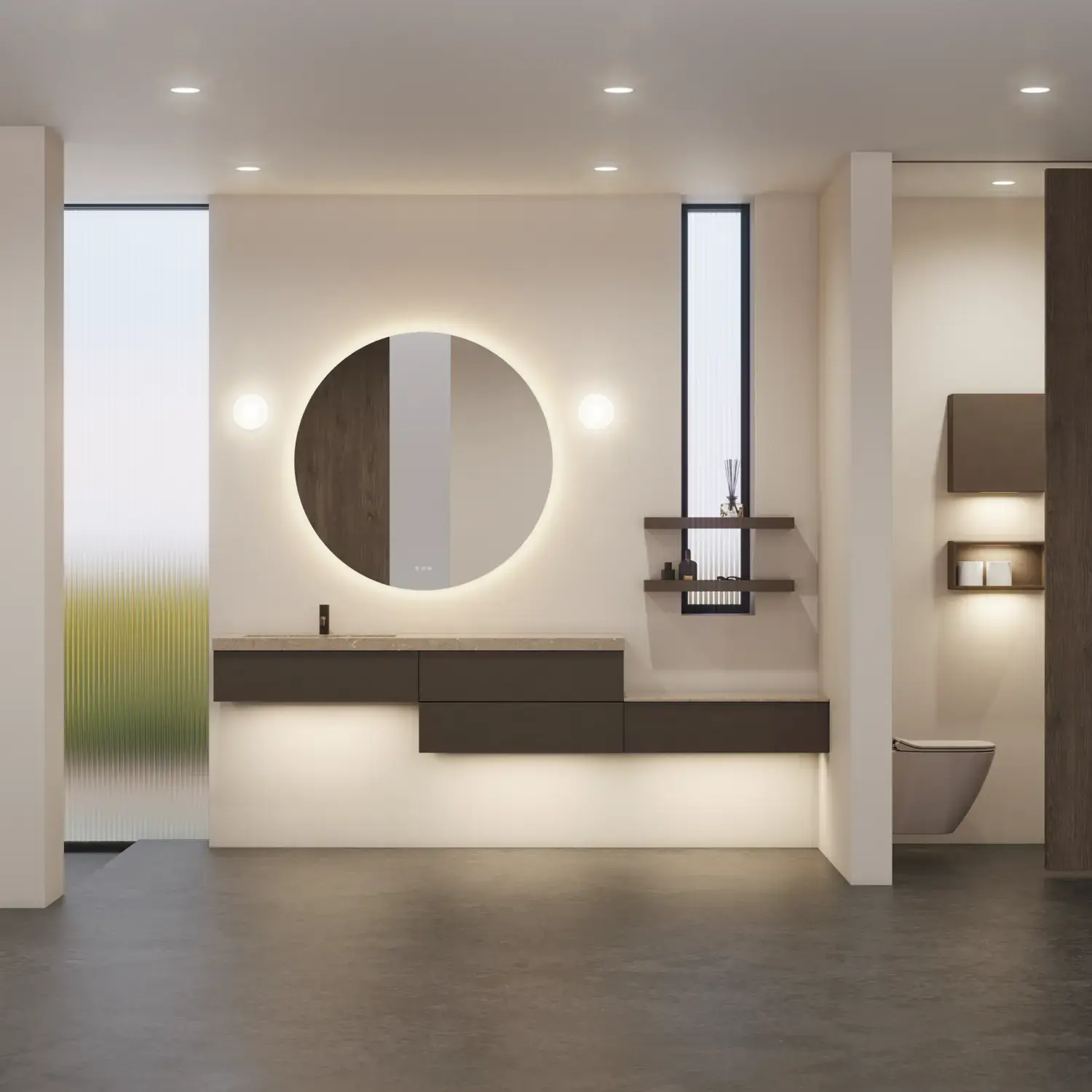 Den flotte vask sætter tonen for et moderne badeværelse, hvor æstetik og funktion går hånd i hånd. Det svævende design og de horisontale linjer giver en let og arkitektonisk balance – et trendy look, der føles både eksklusivt og naturligt på samme tid.