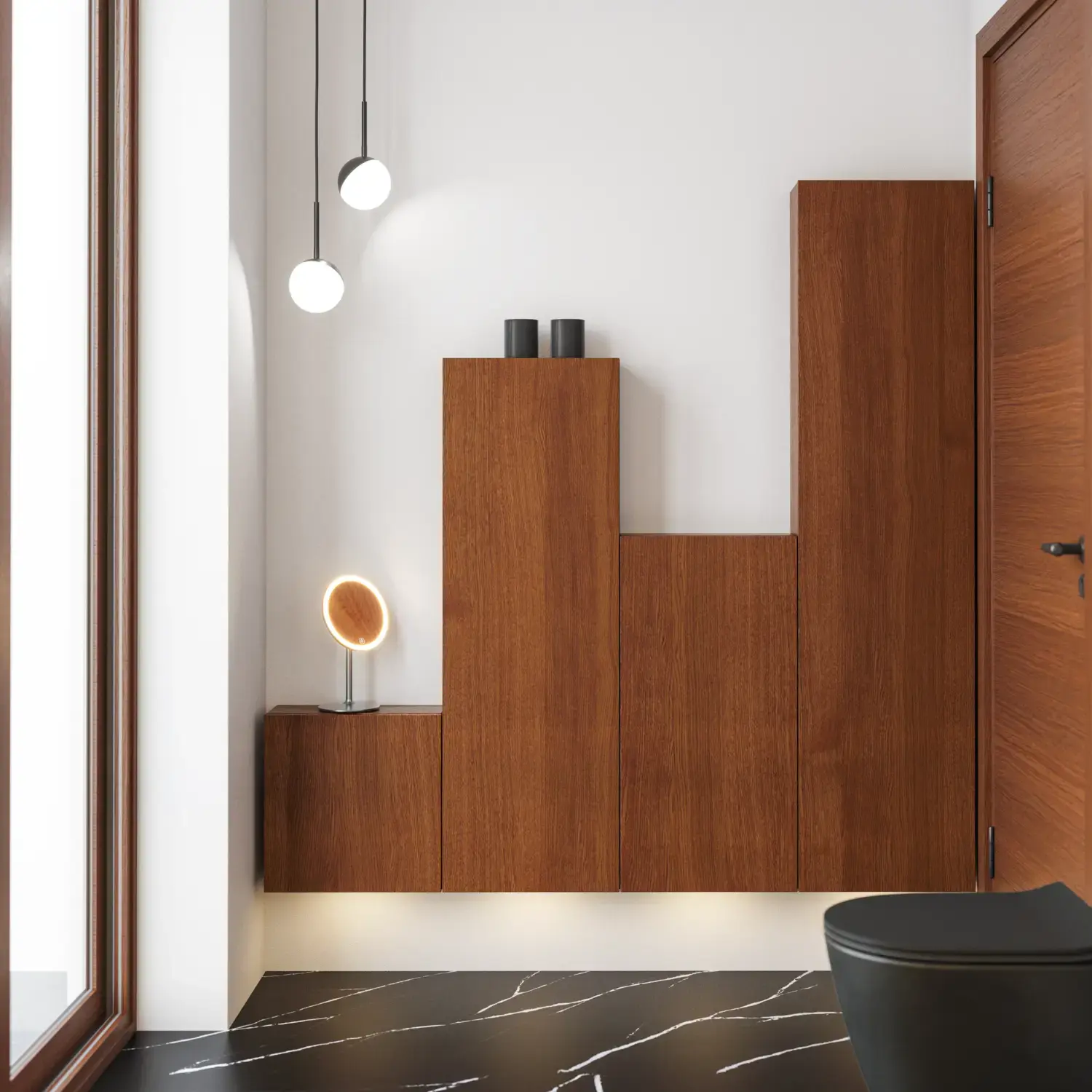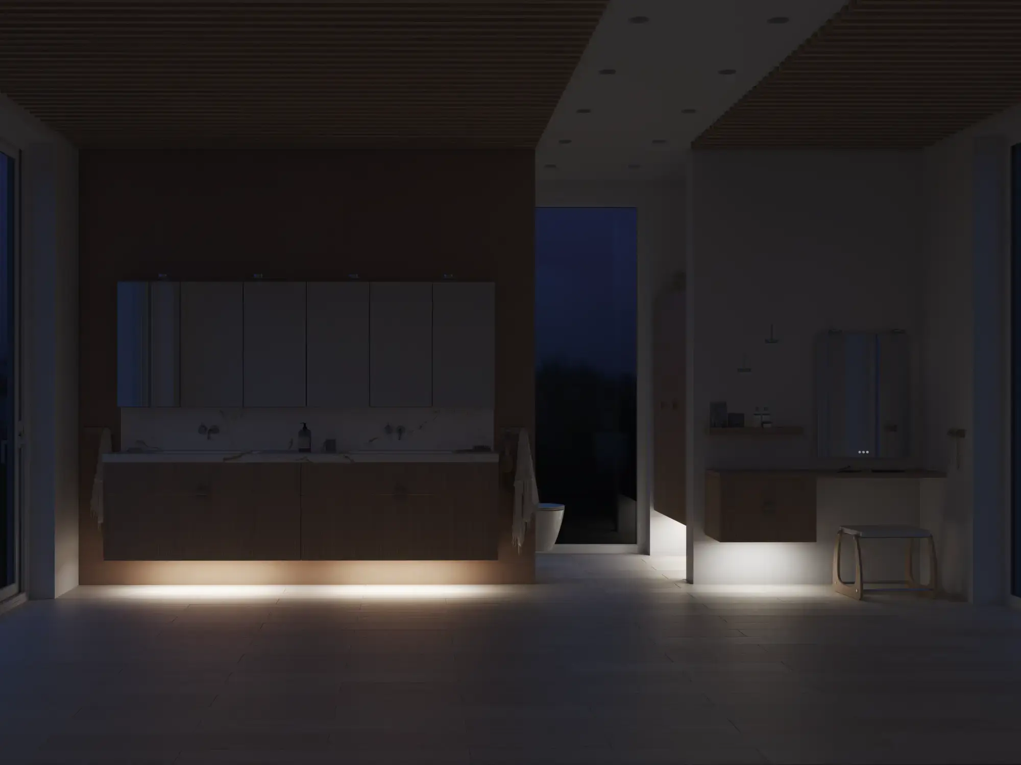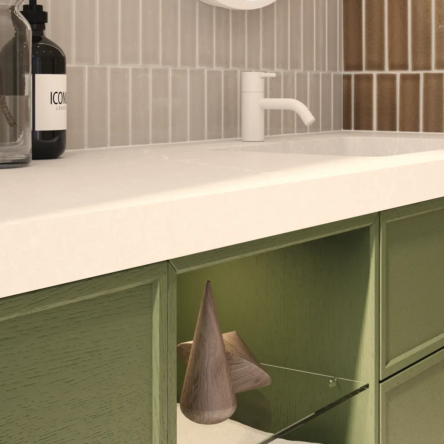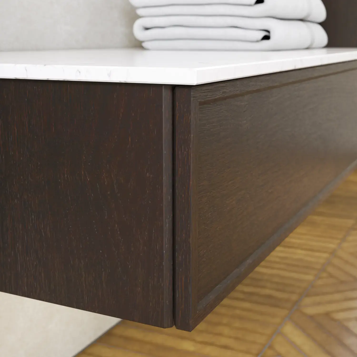 Den flotte vask sætter tonen for et moderne badeværelse, hvor æstetik og funktion går hånd i hånd. Det svævende design og de horisontale linjer giver en let og arkitektonisk balance – et trendy look, der føles både eksklusivt og naturligt på samme tid.