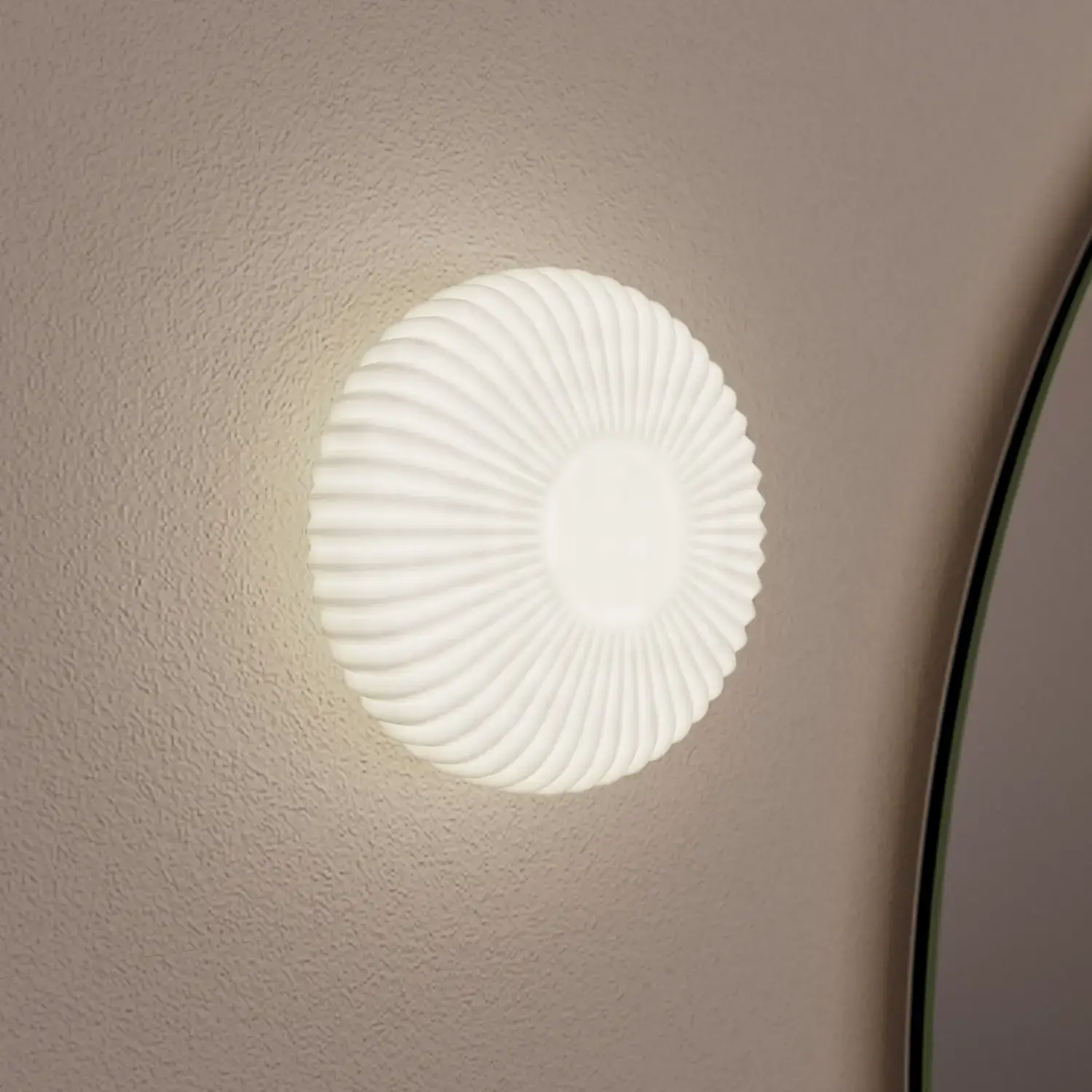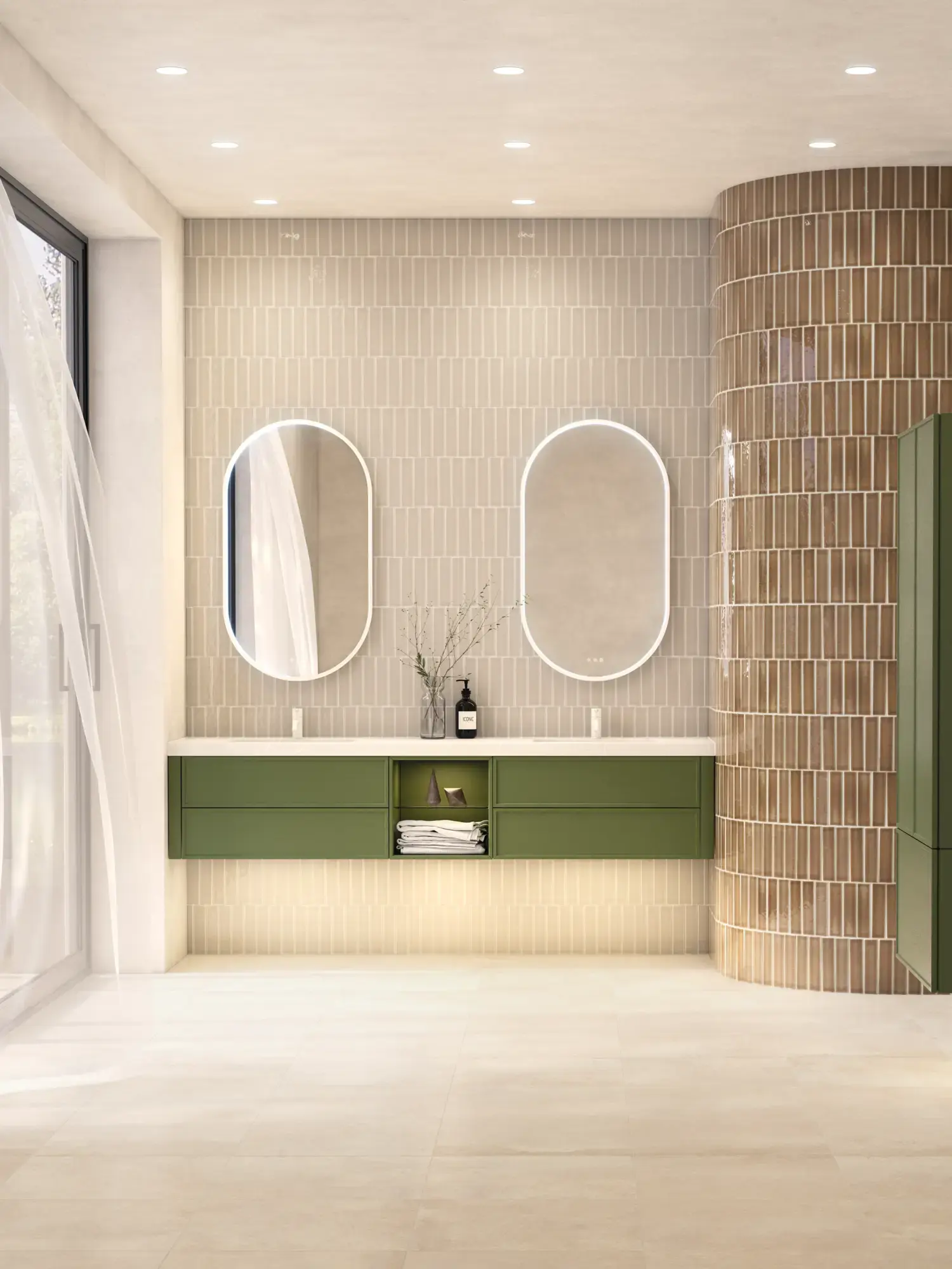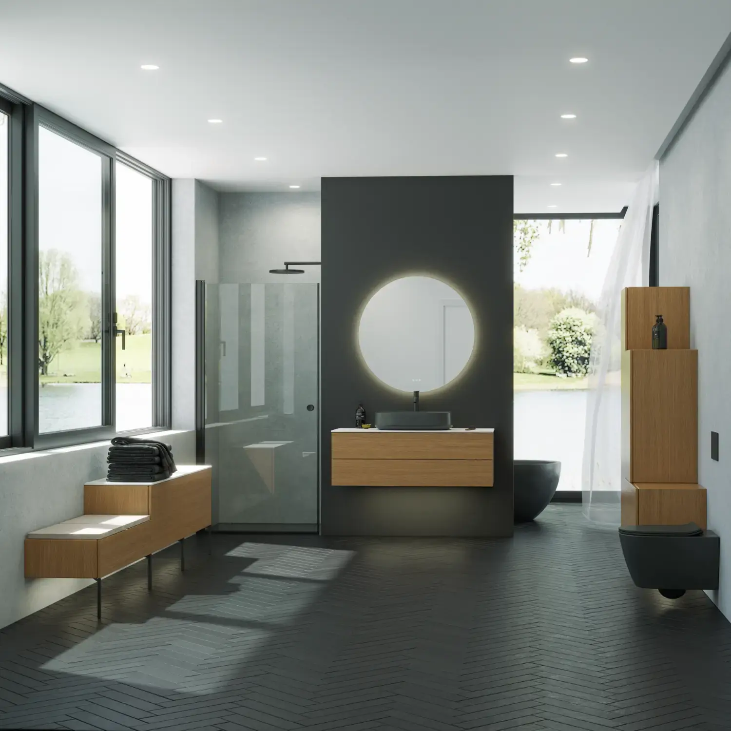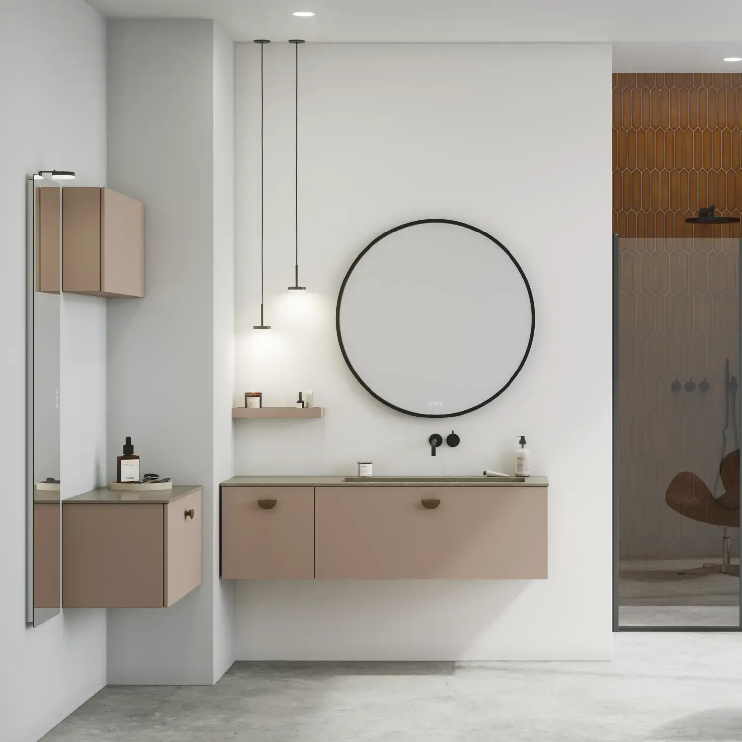 De runde former i Moon-spejlet og det nye, eksklusive Demi-greb i træ tilfører badeværelset en rolig balance og et strejf af varme.
