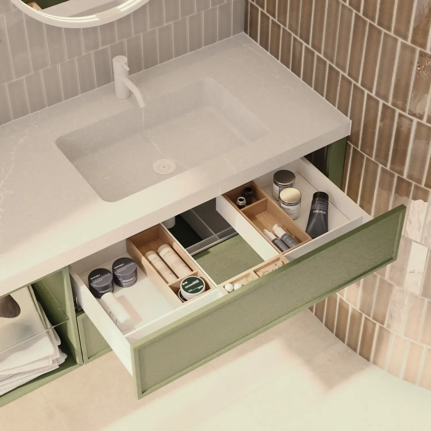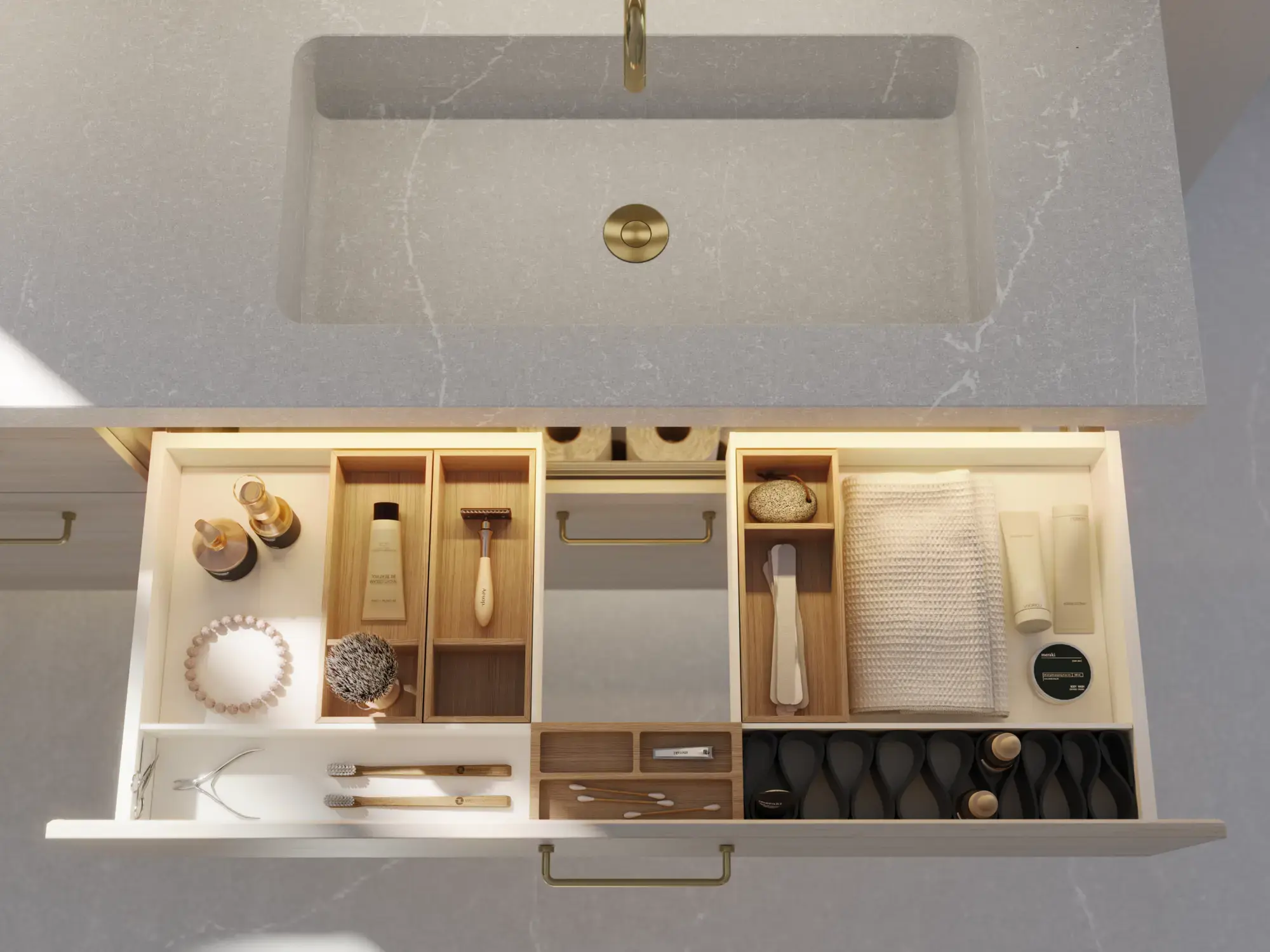 Få styr på indholdet i dine skabe og skuffer med lækkert tilbehør, der giver dig en større brugeroplevelse og gør det nemt at holde et eksklusivt badeværelse rent og pænt.
