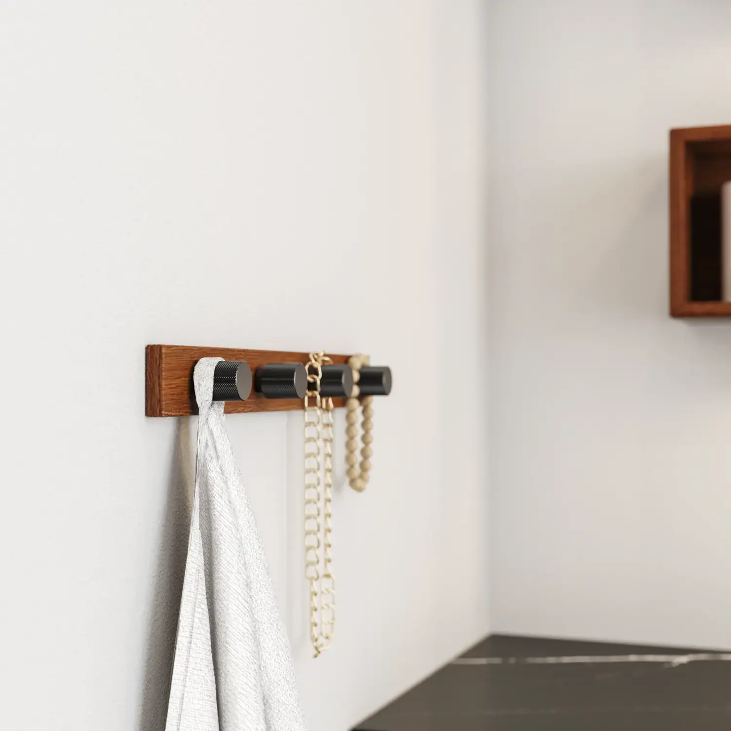 Samtidig skaber den en rolig og indbydende stemning på badeværelset og fungerer som et praktisk afsætningssted til tøj eller håndklæder lige ved bruseren.