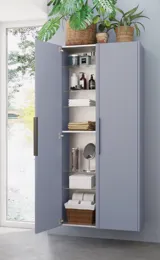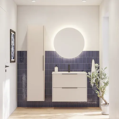 Mido+ Classic lyse sandfarve gør dit badeværelse varmt og indbydende. Udnyt skufferne til stort og småt - her er god plads. Højskabet tilpasser du selv til alle dine flasker og håndklæder med de praktiske 4 flytbare glashylder.