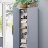 Valget her er enkelt og elegant med stribede fronter og blot én skuffe i vaskeskabet. Det dobbelte højskab giver dig uendelig meget plads, og bemærk, hvordan det sorte greb fuldender udtrykket.