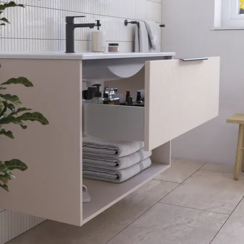 Sæt stemning med et åbent rum i stedet for den nederste skuffe. Her er plads til dine favorithåndklæder og en fin kurv eller krukke, som giver personlighed.