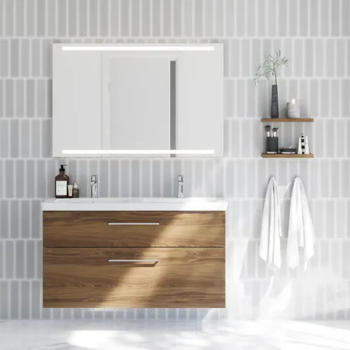 Har du en dobbeltvask? Så er et 120 cm spejl det ideelle valg. Det sikrer, at begge vaskepladser får optimal spejlplads, samtidig med at spejlet binder hele møblet sammen på en harmonisk måde. Et stort spejl vil også skabe mere ro på badeværelset end to mindre spejle. Den store spejloverflade beroliger øjet og gør, at badeværelset vil fremstå mere harmonisk.