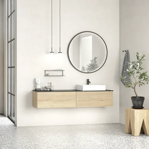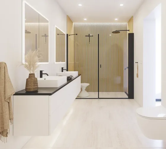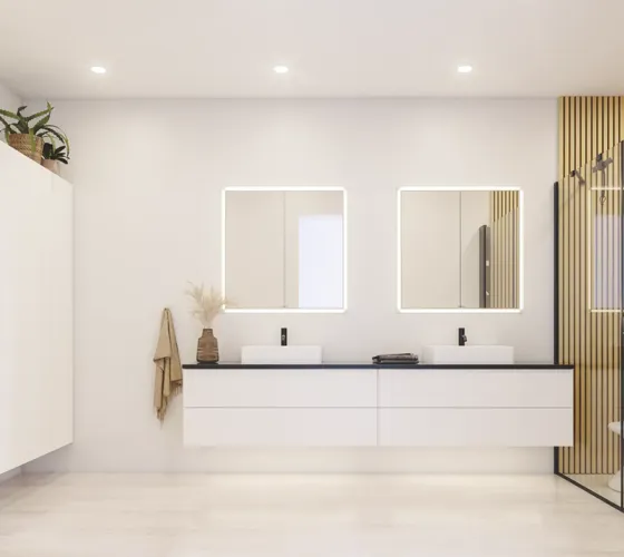 Med to Cube bordstående håndvaske skaber du symmetri og elegance i et stort badeværelse. Den firkantede form og rene linjer skaber en harmonisk balance, mens det dobbelte arrangement giver praktisk funktionalitet. Den moderne æstetik og ekstra plads gør Cube til det perfekte valg for et rummeligt og stilfuldt badeværelse.