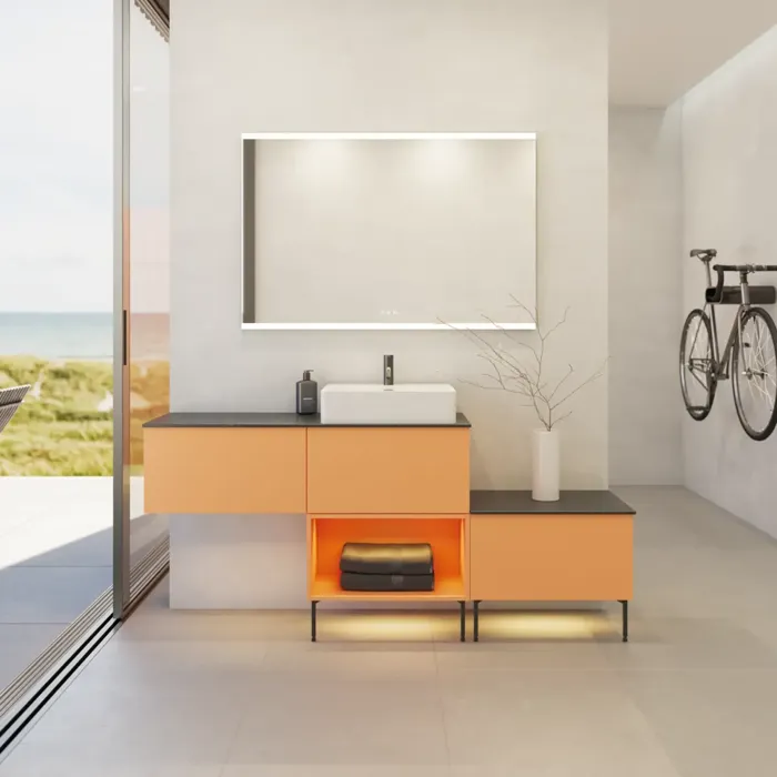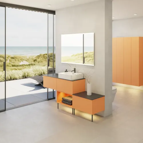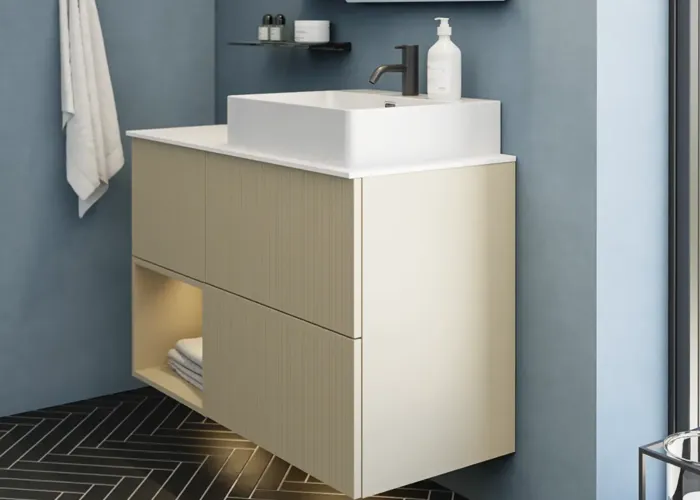 Cube bordstående håndvask med underskab fra YOU Urban forener stil og funktionalitet på perfekt vis. Sortimentet fra YOU Urban giver dig mulighed for at sætte ekstra kant på indretningen, mens evnen til at sammensætte underskabe som moduler tilbyder en skræddersyet løsning, der passer perfekt til dig og din stil. Dette ikke blot tilføjer en unik dimension til designet, men giver også kreative og praktiske opbevaringsmuligheder.